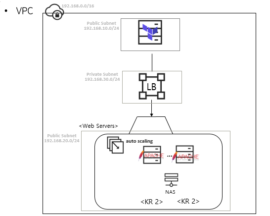 Terraform을 활용에 VPC버전에서 NCP의 Server, LB , NAS 생성과 Server에는 Apache를 설치하는 코드입니다. NAS는 생성과 동시에 mount를 하여 서버접속시 바로 이용할 수 있을 수 있습니다. 아키텍처는 다음과 같습니다.